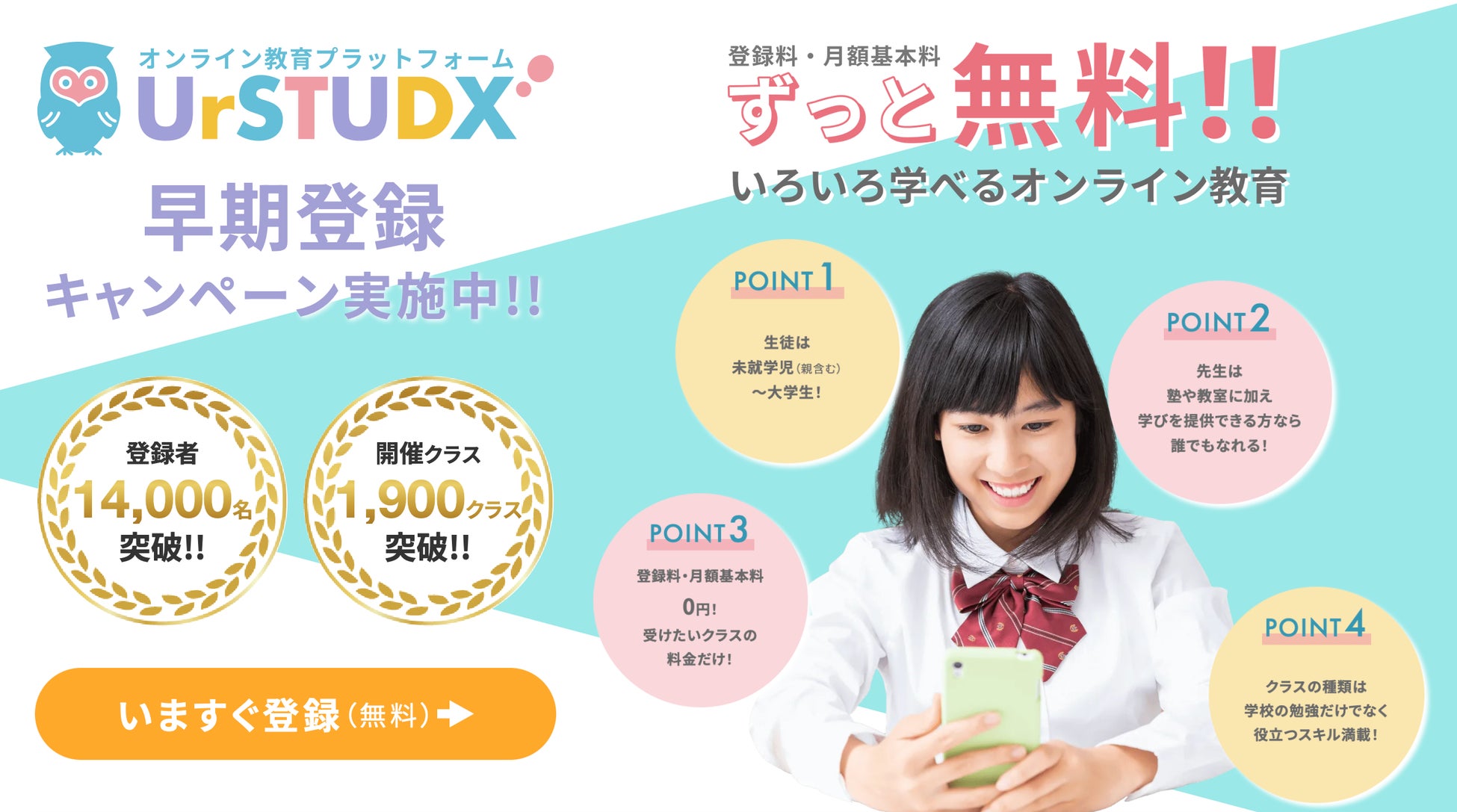 「UrSTUDX(ユアスタディクス)」は、未就学児~大学生の子ども達が、自身の学びたいスキルを、オンライン上で学ぶことができる、教育プラットフォームです。