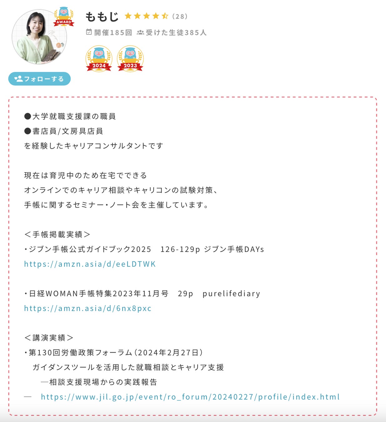 就職支援課の職員や書店員・文房具店員の経験のあるキャリアコンサルタントの”ももじ先生”は、就職支援や手帳に関するオンラインクラスを開催しています。