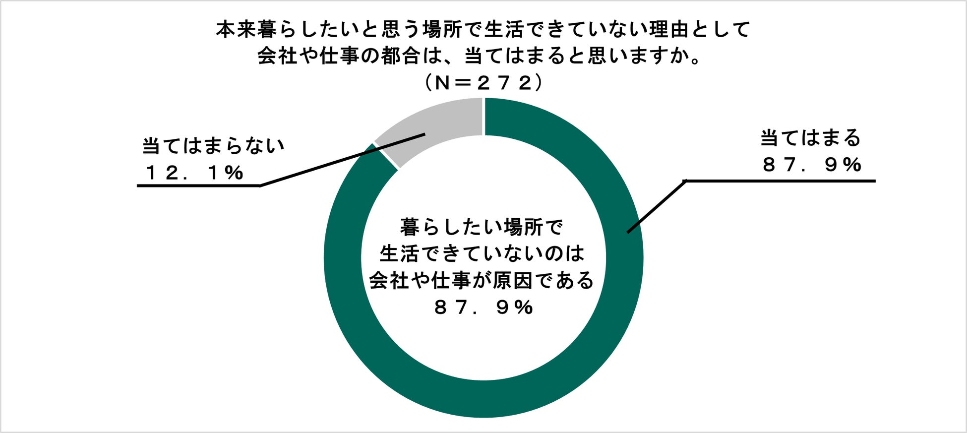 暮らしたい場所で生活できていないと答えた272人に、「原因として、会社や仕事の都合は当てはまるか」と質問したところ、87.9%が「当てはまる」と答えました。
