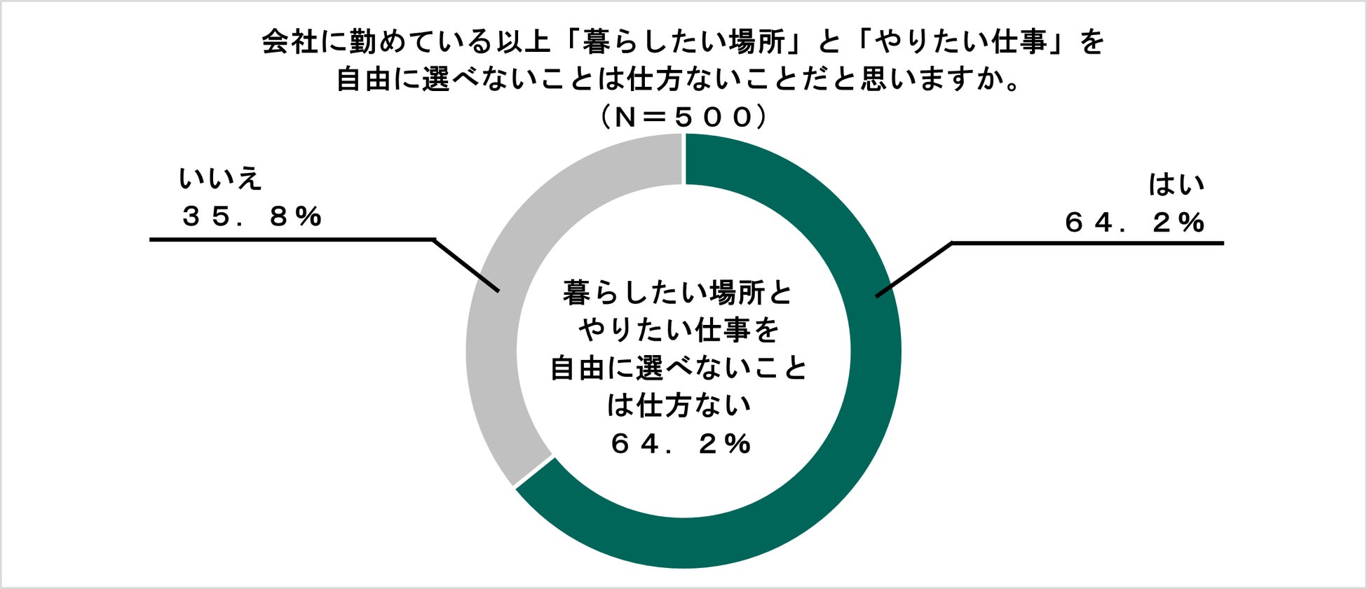 「会社に勤めている以上、『暮らしたい場所』と『やりたい仕事』を自由に選べないことは仕方ないことだと思うか」と質問したところ、64.2%が「はい」と答えました。