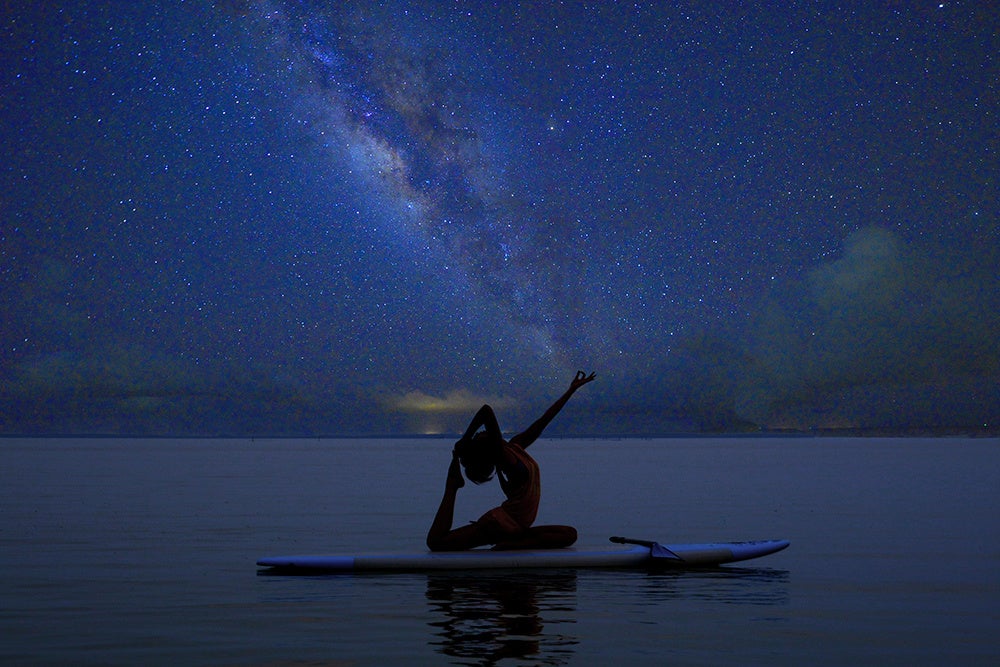 ビーチフロントのプールで海風を感じるSUPヨガは、まるで自然とひとつになるような特別な時間。