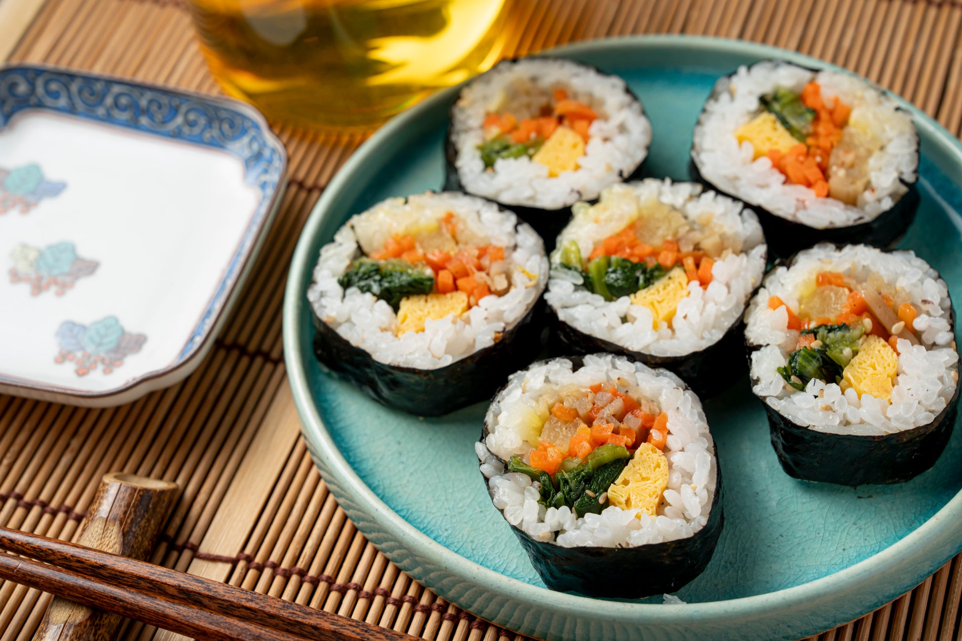 「野菜キンパ」には、にんじんやごぼう、たくあんなど、しゃきしゃきとした歯ごたえが楽しい野菜をたっぷりと巻き込みました。素材の風味を活かしたやさしい味わいは、後味もすっきり。冷たいお茶と一緒に、涼やかにお召し上がりいただけます。