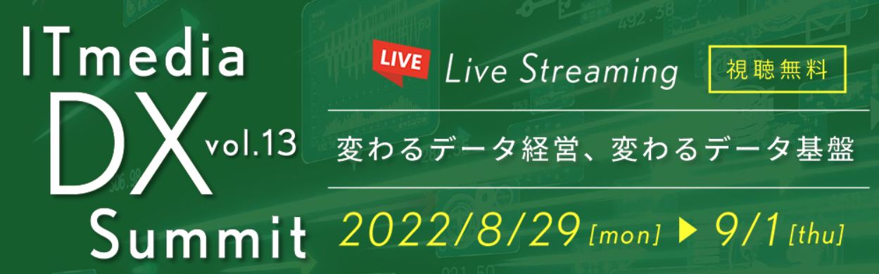 スプリームシステム株式会社(本社:東京都豊島区、代表取締役:佐久間 卓哉)は、2022年8月30日(火)より、アイティメディア株式会社主催のオンラインセミナー「ITmedia DX Summit Vol.13 変わるデータ経営、変わるデータ基盤」にて登壇致します。