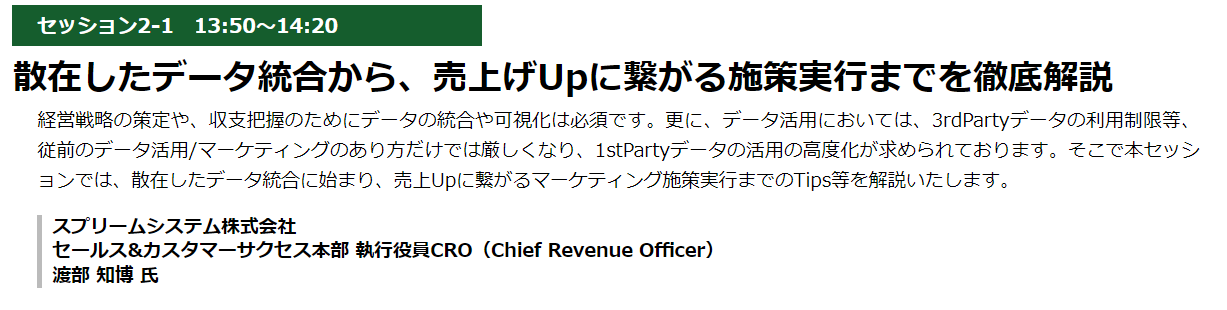 | 概要 | 経営戦略の策定や、収支把握のためにデータの統合や可視化は必須です。 更に、データ活用においては、3rdPartyデータの利用制限等、従前のデータ活用/マーケティングのあり方だけでは厳しくなり、1stPartyデータの活用の高度化が求められております。 そこで本セッションでは、散在したデータ統合に始まり、売上Upに繋がるマーケティング施策実行までのTips等を解説いたします。 |