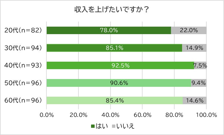 次に、「収入アップしたいか?」聞いたところ、40代の92.5%を筆頭に多くの人が「はい」(20代:78.0%、30代:85.1%、50代:90.6%、60代:85.4%)と答えました。