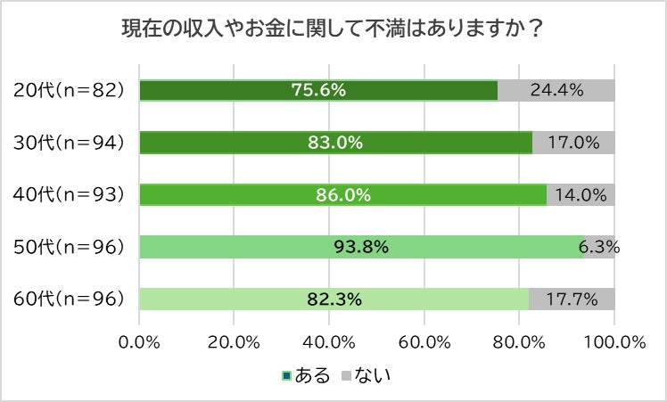 そこで、各年代別に「現在の収入やお金に関して不満はあるか?」聞いたところ、多くの人が「ある」(30代:83.0%、40代:86.0%、60代:82.3%)と答えました。その中で、50代が93.8%と最も多く、最も少ない20代でも75.6%の人が不満を感じています。
