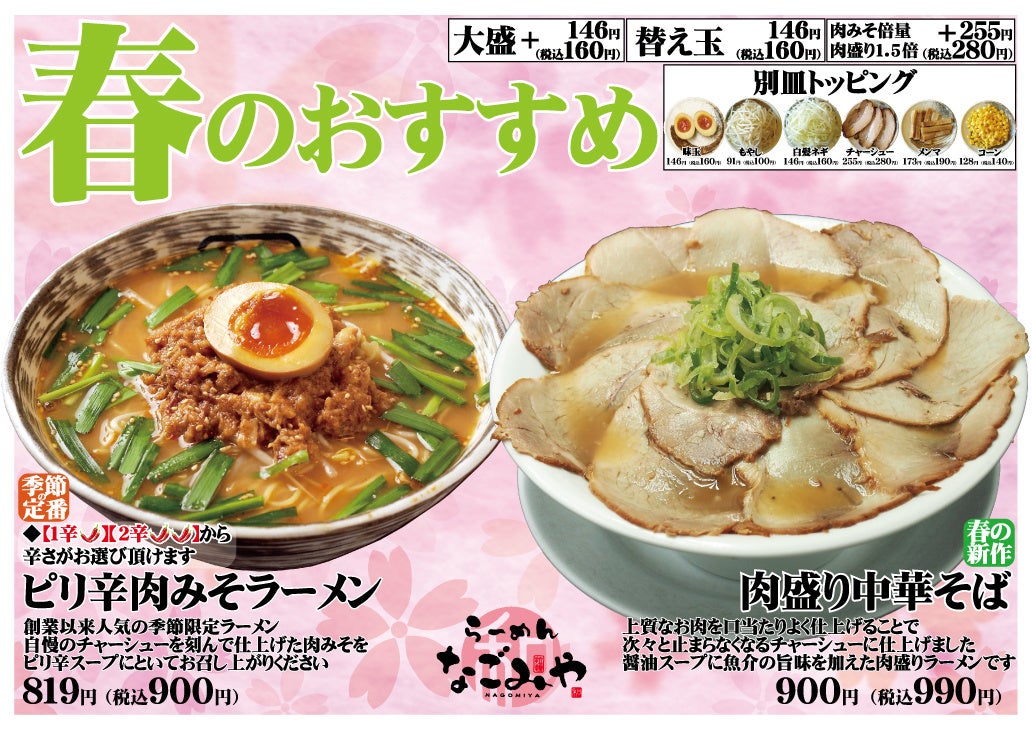 愛知県にて飲食店を展開する株式会社プレジャー(本社:愛知県尾張旭市、代表:小山和紀)が運営する、愛知県春日井市【らーめんなごみや高蔵寺店】は2025年3月1日(土)より、【春のおすすめ】メニューを販売開始いたします。