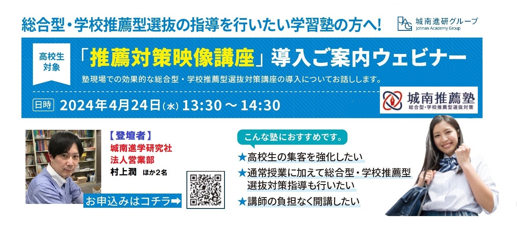 推薦入試対策にお悩みの学習塾の方々へ。4月24日(水)、「城南推薦塾」監修「推薦対策映像講座」導入ご案内ウェビナーを開催します。