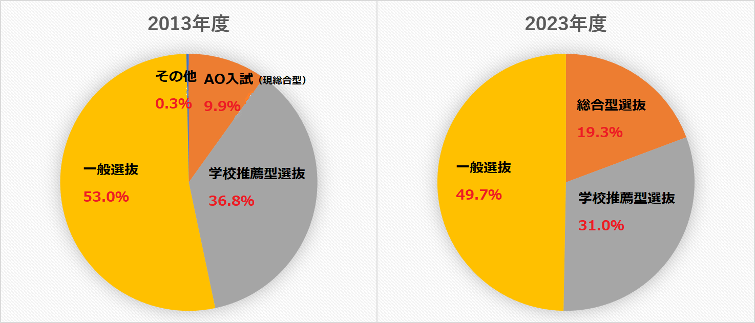 ここ数年、総合型選抜は一貫して増加し続けており、2013年度と比較してみても、総合型選抜における割合は9.4%も増えています(下図参照)。学校推薦型は若干の増減はあるものの、おおむね同程度で推移。対して、一般選抜は減少し続けています。