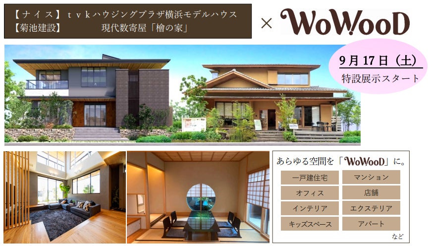ナイス株式会社(本社:神奈川県横浜市、社長:杉田 理之)が日本最大級の住宅総合展示場「tvkハウジングプラザ横浜」に出展するモデルハウスが、このたびオープンから一周年を迎えます。これを記念して、同モデルハウス内において、当社が提案する未来を彩る木質空間「WoWooD™ (ワウッド)」の特設展示を9月17日(土)より実施いたします。