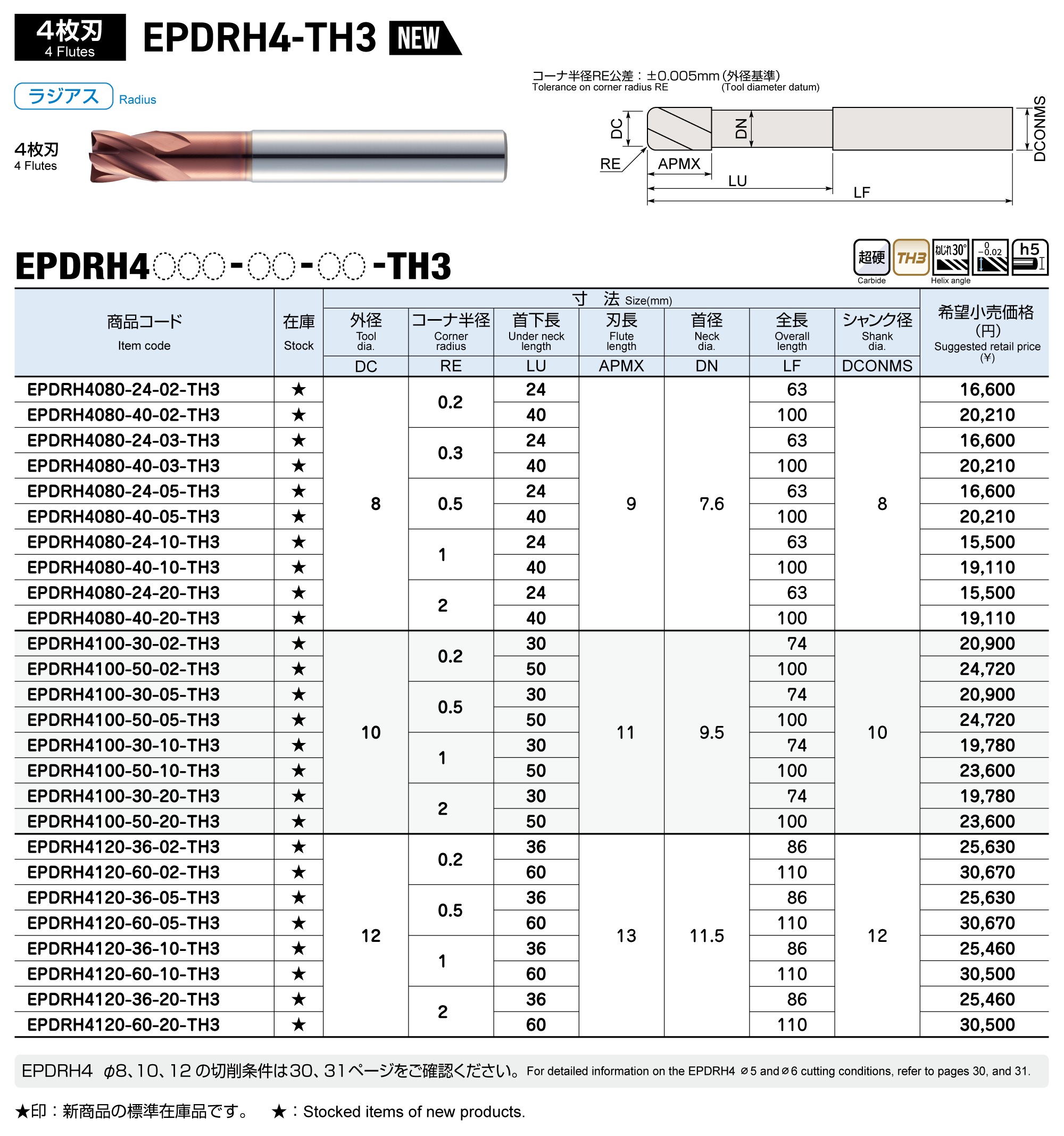 高硬度鋼加工用 4枚刃ラジアスエンドミル エポックディープラジアスハード-TH3「EPDRH-TH3」 2025年12月22日 新発売