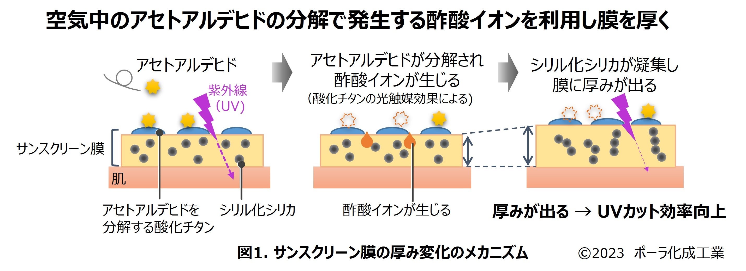 我々はこれまでの研究の蓄積から、ある種の粉体が凝集すると膜の厚みが増すことを突き止めていました。なかでも自社で独自開発したUVカット粉体(シリル化シリカの一種)が、溶液中のイオンと反応することで凝集し互いにつながって大きな構造を取るようになること、またこの粉体を含む膜は実際に「イオンと出会うと厚みが増す」ことが分かっていました。つまり、膜にイオンを供給できれば、膜を厚くすることができるのです。そこで、大気汚染ガスであるアセトアルデヒドを分解する自社技術(※3)で酢酸イオンが生じることをうまく利用することとしました。研究の結果、酢酸イオンにより膜の厚みが増し、UVカット効果を維持できるサンスクリーン技術の構築に成功にしました(図1、補足資料)。