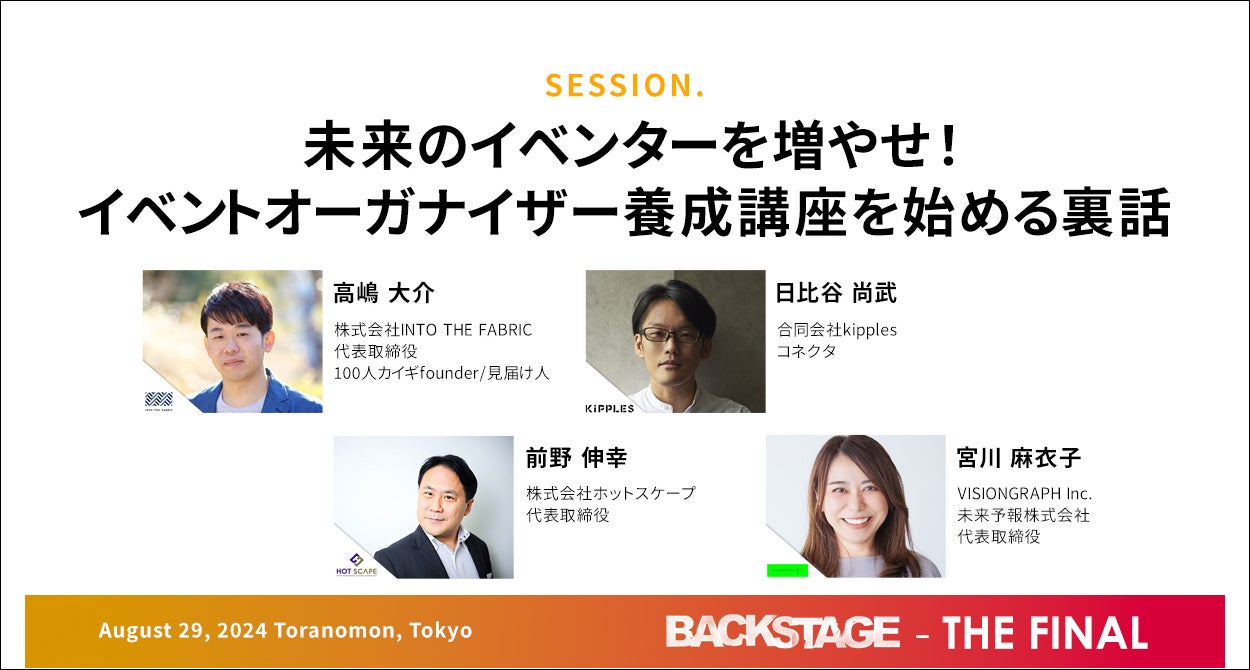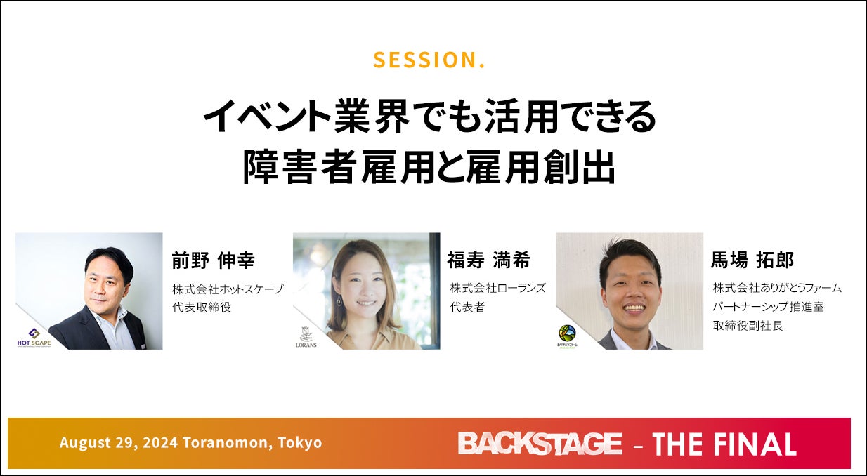 創業以来「万全な直接受注体制」のもと、イベントの企画・制作・運営を行う株式会社ホットスケープ。当社では、2016年初開催からイベント業界の活性化を目指し、イベントの裏側を体感でき、新たな出会いや気づきを得られる体験型マーケティングカンファレンス「BACKSTAGE」を開催してきました。この夏2024年8月29日(木)虎ノ門ヒルズにてファイナルイベントを開催いたします。