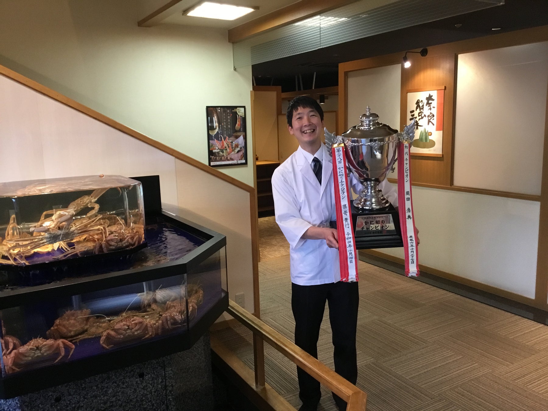 この度はかに道楽、全国かに切チャンピオン決定戦に勝利し、28代かに切チャンピオンの座に付けた事を大変嬉しく光栄に思っています。決定戦当日、緊張感張り詰めた会場、そして社長、役員を含めた多くのギャラリーの中でリラックスでき、程よい緊張感の中、自店で行っている普段通りのかに切を出来たことが勝因でした。