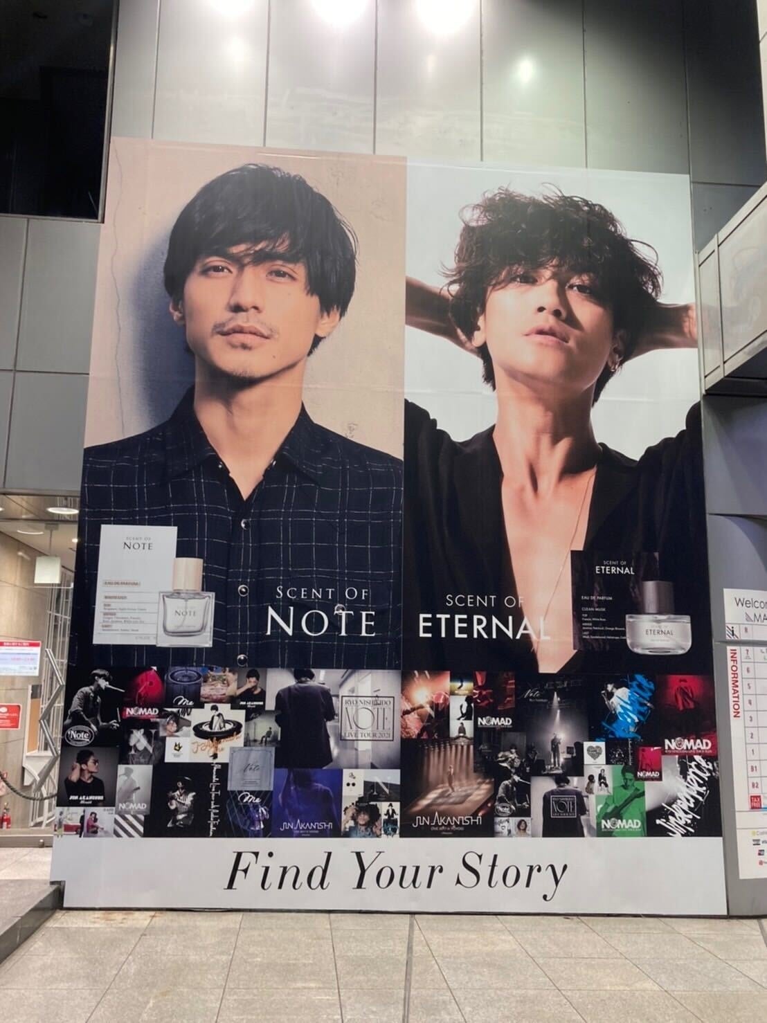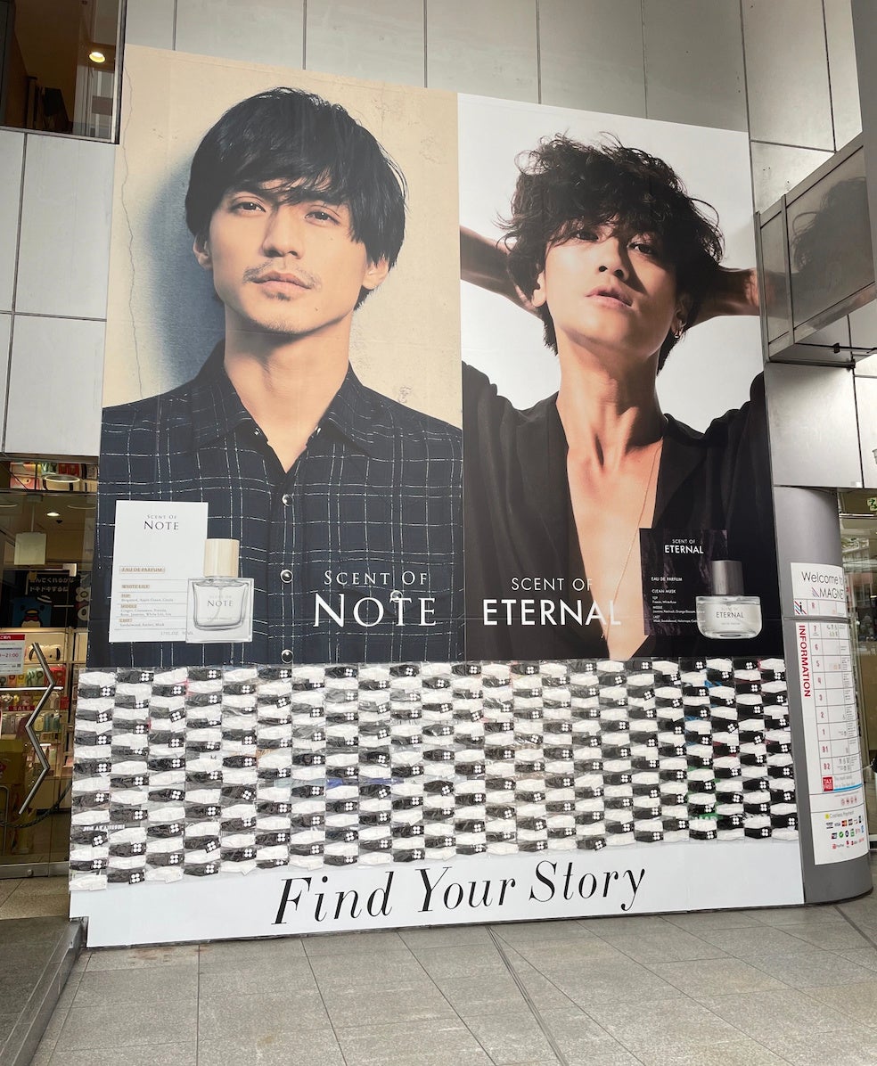 錦戸亮と赤西仁それぞれがプロデュースする香水「SCENT OF NOTE(セントオブノート)」並びに「SCENT OF ETERNAL(セントオブエターナル)」の発売を記念して、香水の香りを試せる香り付きマスクのピールオフ広告を2022年5月1日(日)より7日(土)までの1週間、「MAGNET by SHIBUYA109」のエントランスイベントスペースに掲出いたしました。