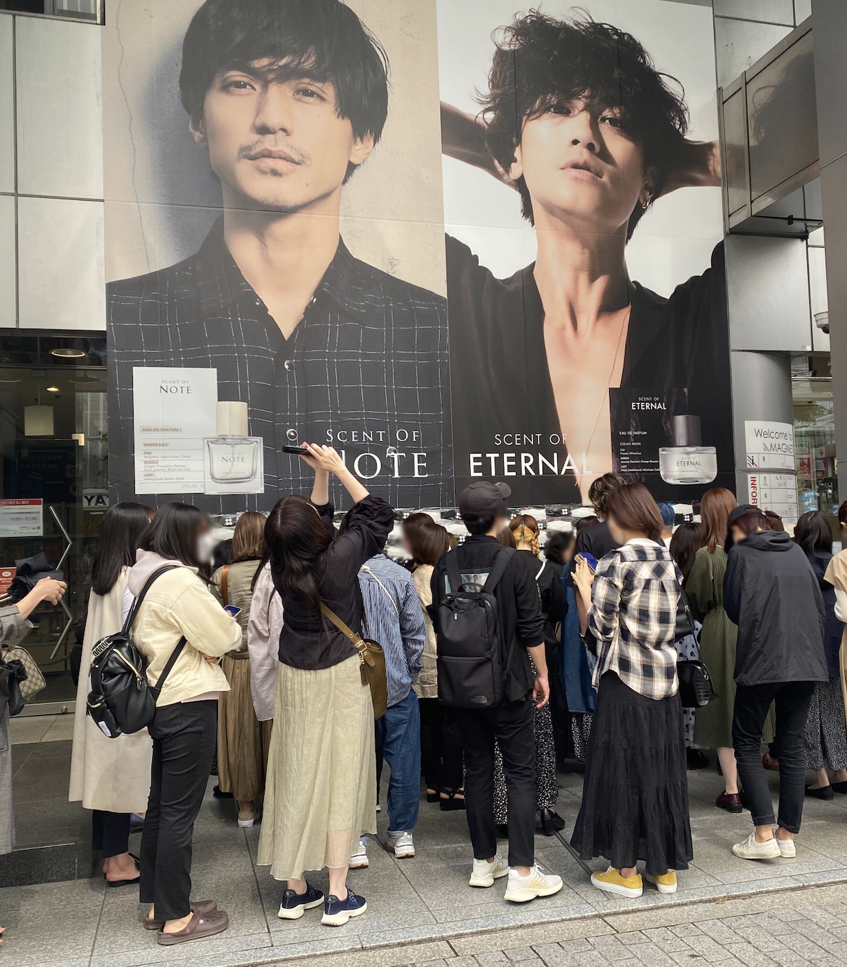 5分以内に300枚以上のマスクがすべて無くなる盛況ぶり!錦戸亮・赤西仁がプロデュースする香水「SCENT OF NOTE」「SCENT OF ETERNAL」発売を記念した「マスクピールオフ広告」を掲出。香水の香りを試せる香り付きマスクを剥がすと二人の独立後のジャケット写真が出現(2022年5月1日(日)~7日(土) MAGNET by SHIBUYA109)