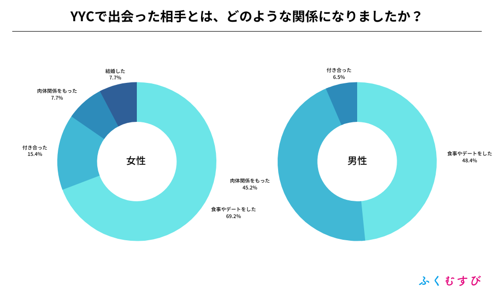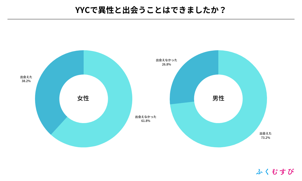 ・YYCで異性と出会えた割合は、男性が73.2%、女性が38.2%となりました。