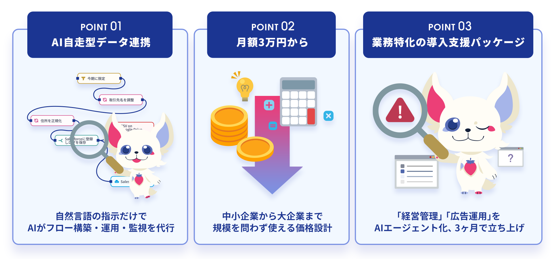 Point2 : 月額3万円から ── 中小企業から大企業まで、規模を問わず使える価格設計