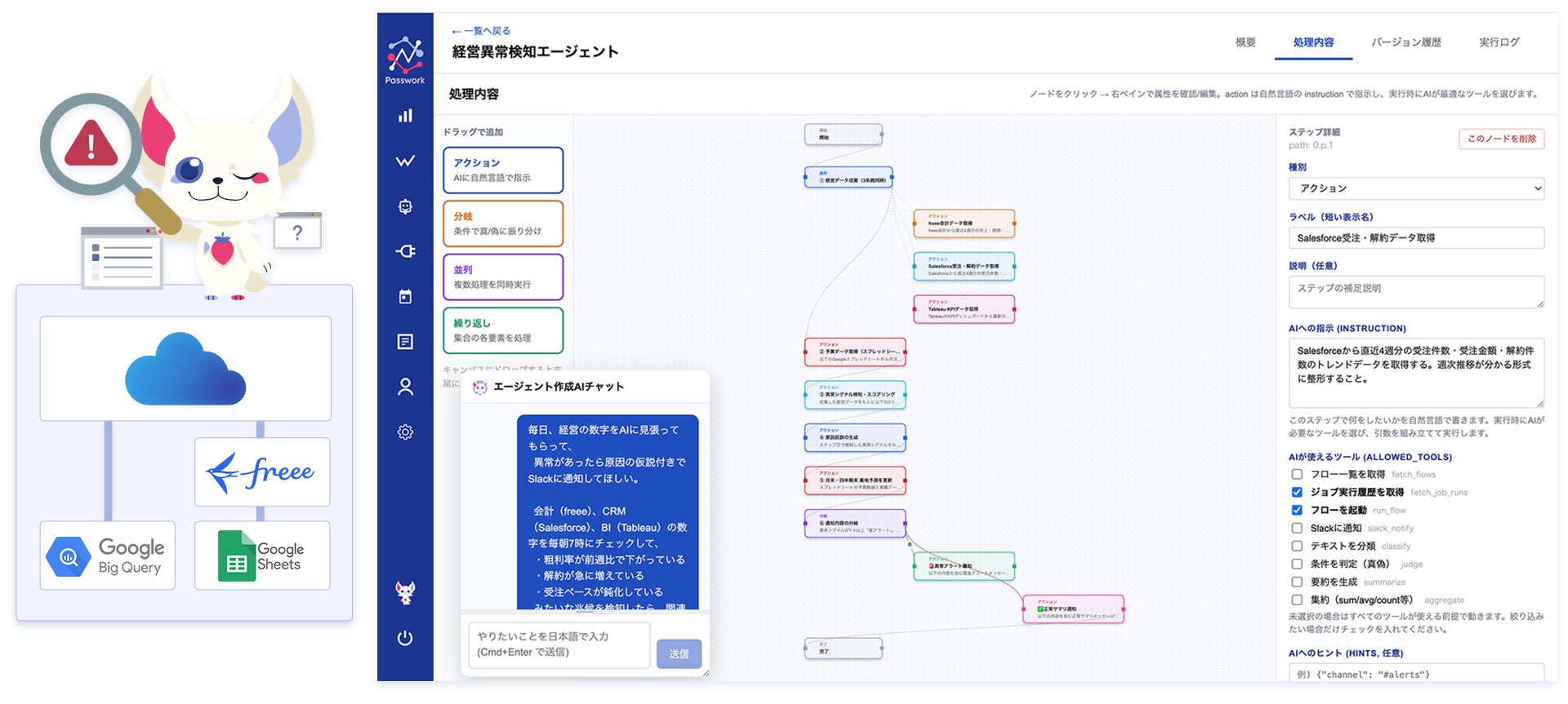Point1 : AI自走型データ連携 ── 自然言語の指示だけで、AIがフロー構築・運用・監視を代行