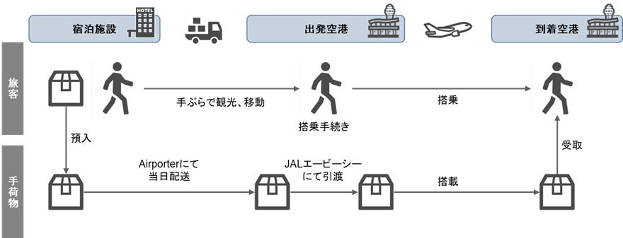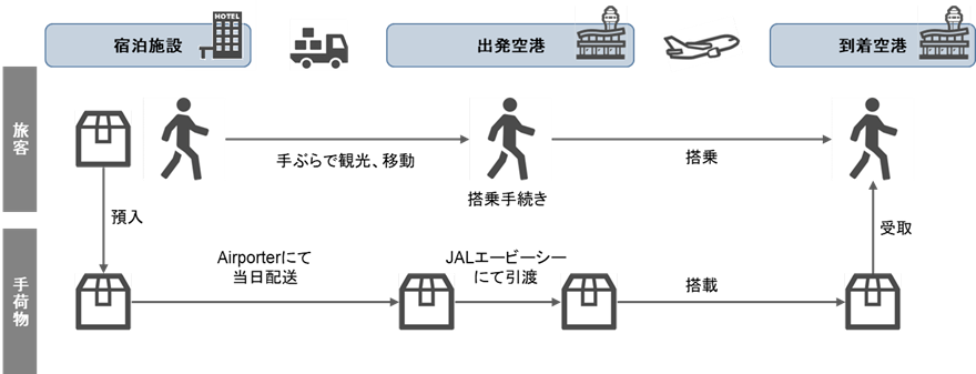 実施内容 | 大阪市内の宿泊施設を利用し、かつ関西国際空港発JAL便を利用する旅客を対象に、 宿泊施設から海外空港へ手荷物を直送するサービスを提供 |
