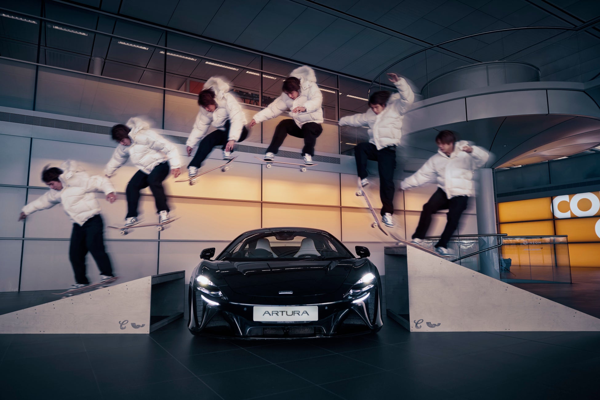 彼はマクラーレン・テクノロジー・センターの歩道で、McLaren Arturaを飛び越える華麗なランプ・トゥ・ランプ・ジャンプを披露。さらに、有名な地下通路や伝説的なロードカー、レーシングカーの前でもトリックを演じる
