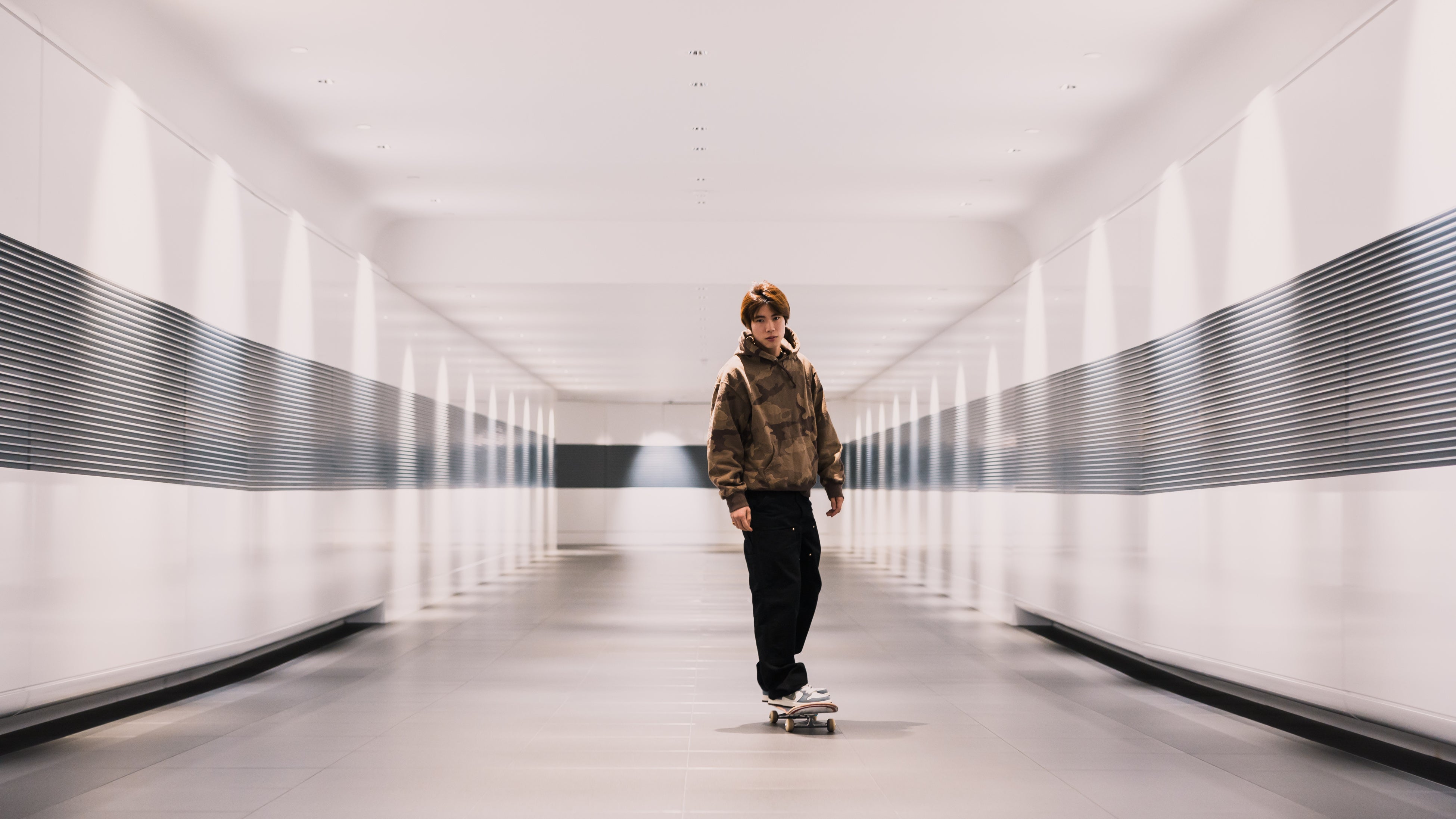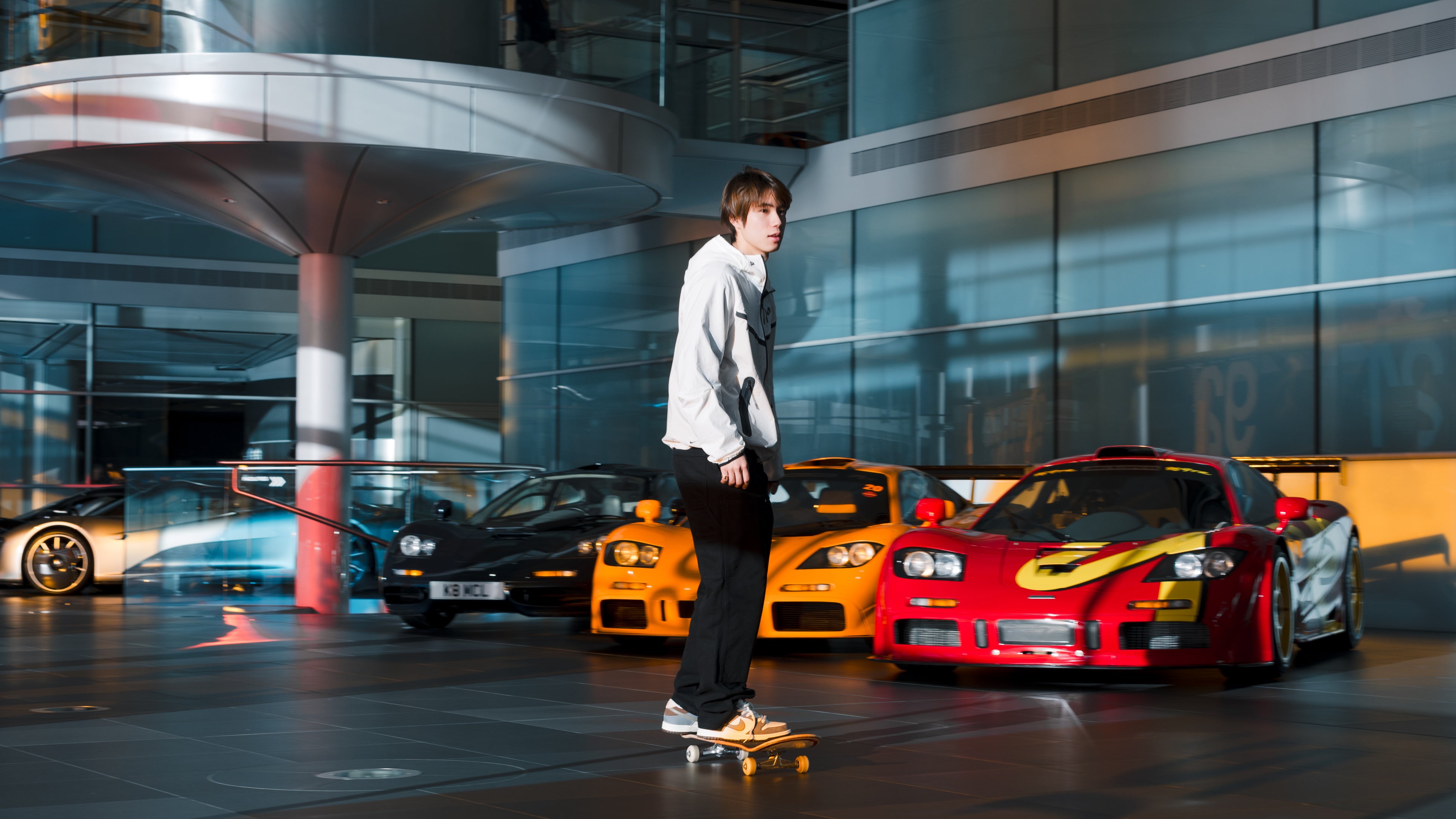 英国・サリー州ウォーキングにあるMTCは、世界的に高名なイギリス人建築家ノーマン・フォスター卿が設計を手掛け、マクラーレンのブランドアイデンティティを建築という手段で表現した傑作です。堀米雄斗さんは、このMTC内をスケートボードとともにめぐり、伝説のレーシングカーやマクラーレンの製造ラインの見学などを堪能しました。