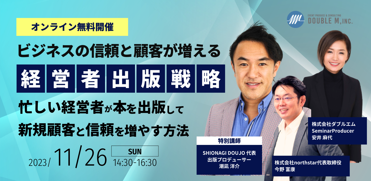 すでに多くの経営者の出版をサポートしてきた潮凪洋介氏、数々の企業の経営課題を解決してきた今野富康氏、そして当会理事の安井麻代がタッグを組み、最短で商業出版を実現して、出版からの売上アップを成功に導く「経営者出版戦略」の自社への導入方法をステップバイステップでお伝えします。
