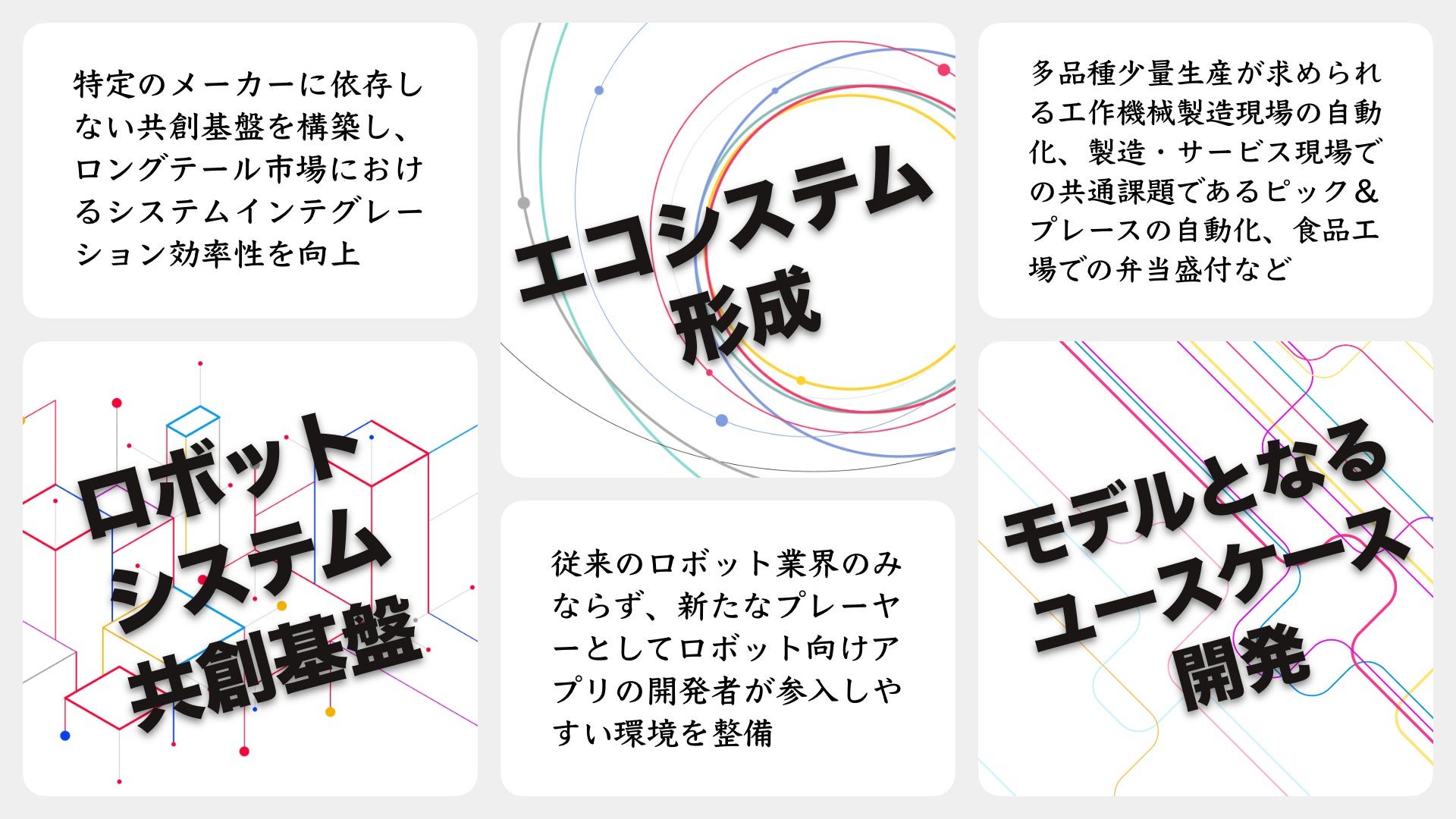 本事業を通じて、実用に耐えうる「共創基盤」と「エコシステム」を構築し、国内外のロボットメーカー、システムインテグレーター、アプリ開発者等のロボットに関わるステークホルダーへの提供を通じて、共創環境の実現を目指していきます。これにより、ロボット業界が一丸となり、様々な分野におけるロボット導入を加速させ、労働人口減少という大きな社会課題の解決に貢献していきます。