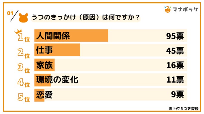 うつ病のきっかけ、第1位は「人間関係」2位「仕事」3位「家族」という結果に。また具体的なエピソードを調査しました。