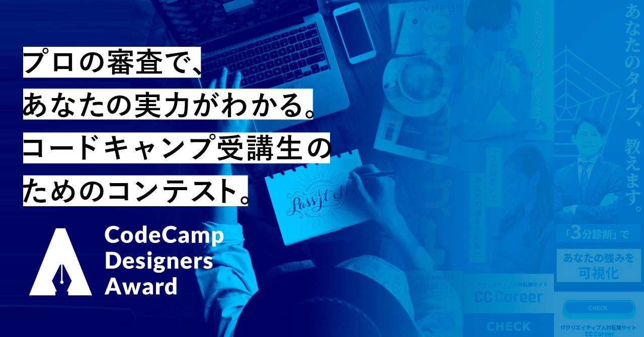 CodeCampデザイナーズアワードでは、実際のWebデザイン制作の現場を想定してクライアントから細かく指定された要件に沿ってデザインを作成し評価を受ける実践形式のコンテストです。Webデザインコース(https://codecamp.jp/design/master_design)・Webデザイン副業コース(https://codecamp.jp/design/fukugyo)・バナー制作副業コース(https://codecamp.jp/design/banner)などでWebデザインを学ぶCodeCampの受講生が参加しています。