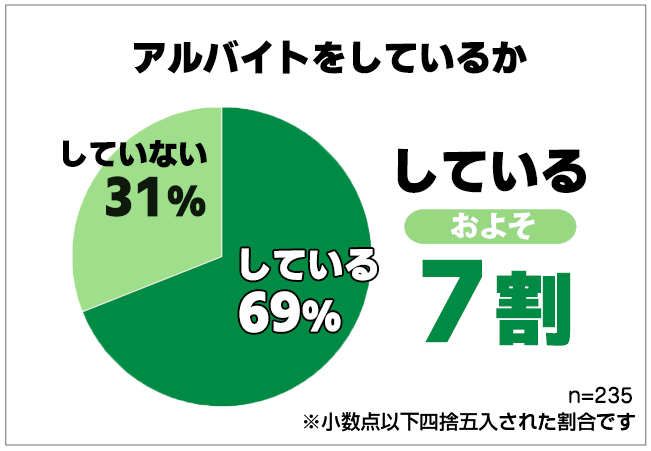 割合としては、アルバイトをしている学生はおよそ7割。1ヶ月のアルバイト代は3万円~5万円未満が最も多く、全体の約3割となりました。