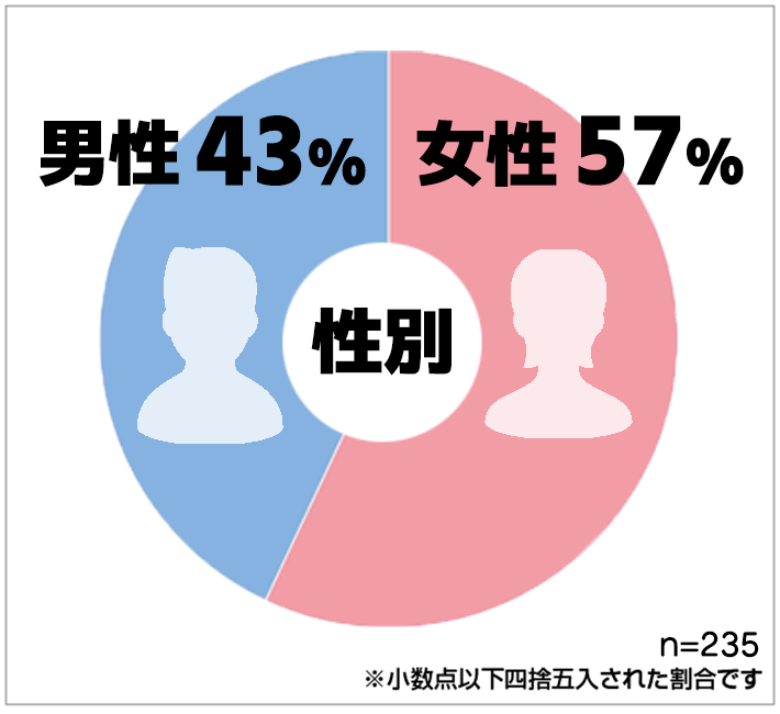 学生235人、以下の男女比でアンケート「学生のお金事情について」に回答をいただきました。