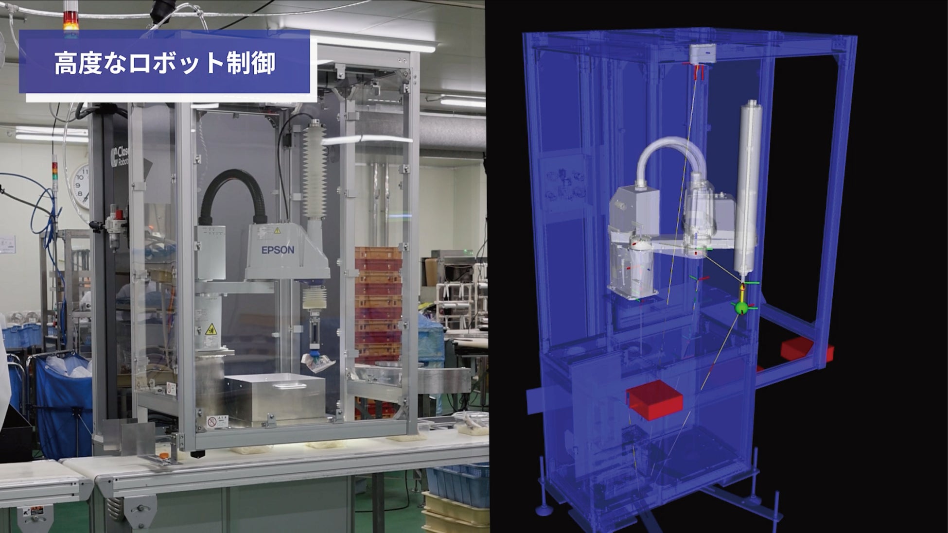 高度なロボット制御:3DビジョンAIや各種センサと密に連携し、瞬時に計算する高度なロボット制御技術により、高速な小袋投入を可能にしました。これらのシステム連携およびロボット制御は、クローサーが開発するロボットソフトウエア基盤(OS)上で動作することにより実現しています。今回の開発では、セイコーエプソン株式会社の協力のもと、クローサーのロボットソフトウエア基盤(OS)とロボットアームの接続を行い、高度なロボット制御を実現しました。