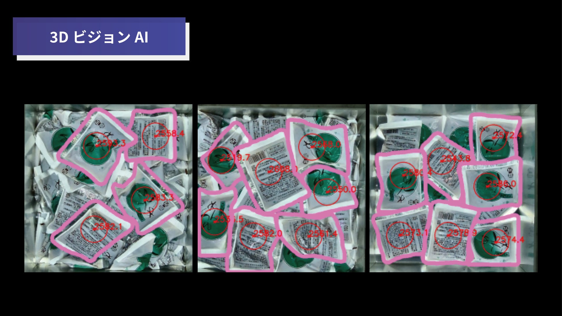 3DビジョンAI:不定形状の小袋の認識に特化させた3DビジョンAIを開発し、高速かつ高精度な認識精度を実現しました。この技術は他の不定形状物体の認識にも応用可能です。