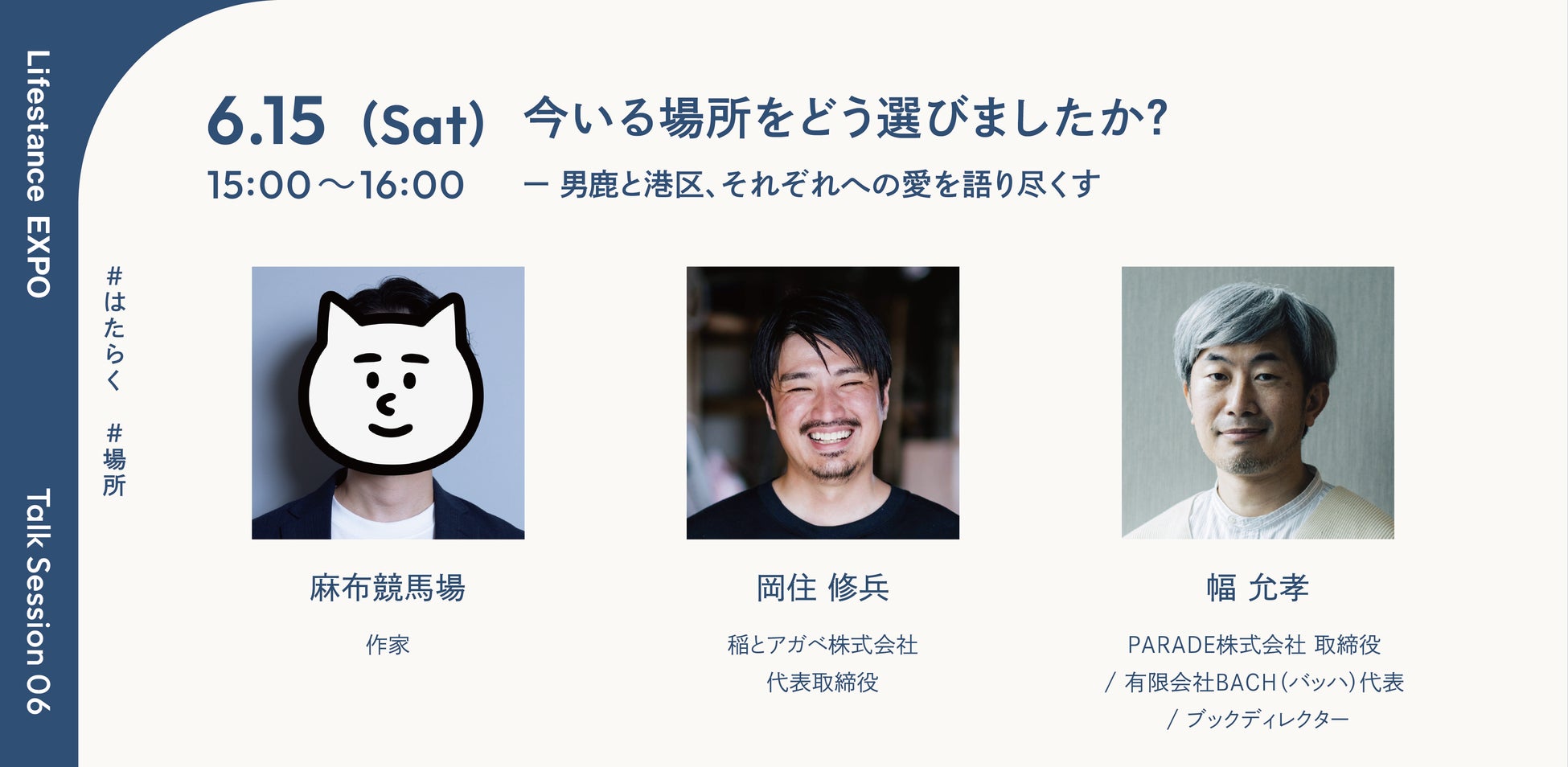 そんな時代だからこそ、はたらく・生きると密接な「場所」の選び方にはライフスタンスが現れるのではないでしょうか。東京と京都で二拠点生活を実践するPARADEの幅允孝さんをファシリテーションに、東京港区を拠点に、都心のタワーマンションなどを舞台にした「タワマン文学」の旗手である麻布競馬場さん。移住先の秋田県男鹿市でクラフトサケ醸造所を立ち上げ、「男鹿を酒の聖地」とすることを目指し事業を展開している岡住がはたらく「場所」を通してライフスタンスを考えるトークセッションをします。
