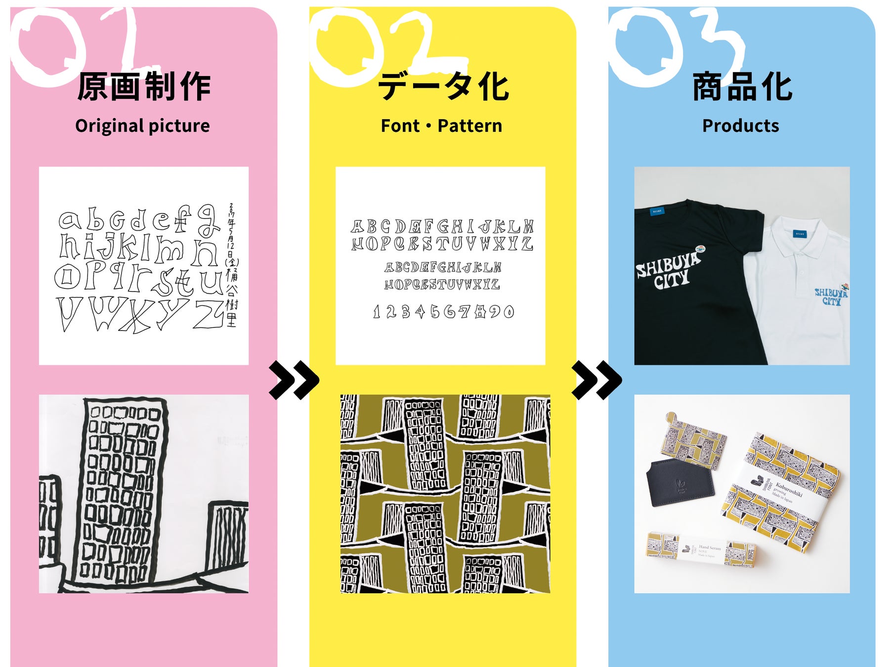 「ご当地フォント」の新チームは1年を通して、障がいのある人の創作支援、障がい者支援事業所との連携、フォント・パターンの制作方法、著作権・商標権・使用許諾の推進、データライセンスの営業など「ご当地フォント」事業を進める上での多様な学びと実践を得て、毎年4月28日に、「シブヤフォントラボ」や「渋谷ヒカリエ」で発表会をおこなっています。