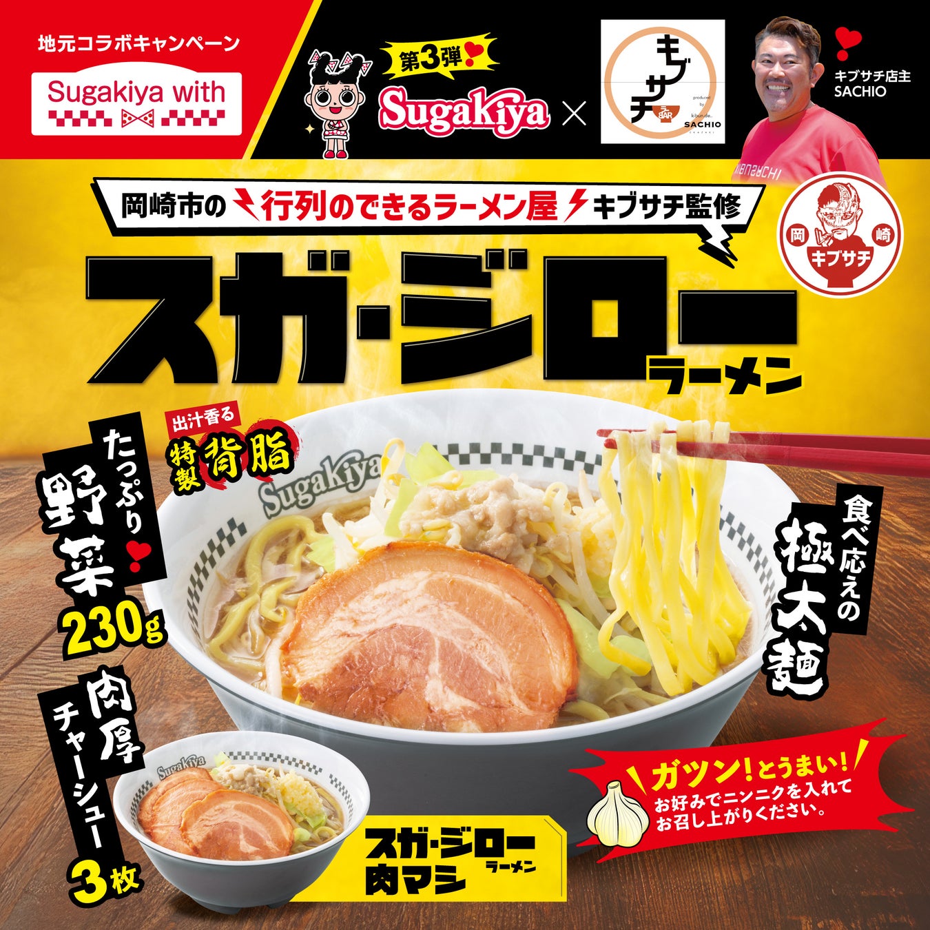この度、「Sugakiya with」第3弾として、愛知県岡崎市にお店を構え、XやYouTubeでフォロワー数10万人を超える人気店「キブサチ」監修で、スガキヤ初の二郎系ラーメン「スガ・ジローラーメン」と、ガッツリ食べたい方も満足の「炭火焼き 焼き鳥丼」を2024年10月10日(木)よりスガキヤ252店舗で販売いたします。