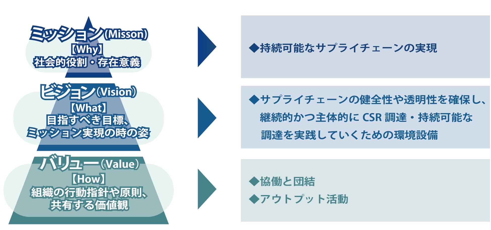 提言書の改定に伴い、改めてCSR 調達・持続可能な調達の「あるべきプロセス」を議論する過程で、分科会としてのミッション・ビジョン・バリューを制定しました。本分科会のミッションは「持続可能なサプライチェーンの実現」です。上流だけでなく自社内や下流も含めたサプライチェーン全体において持続可能性を実現していくことを目指します。また、ビジョンとして「サプライチェーンの健全性や透明性を確保し、継続的かつ主体的にCSR 調達・持続可能な調達を実践していくための環境整備」を掲げています。CSR調達・持続可能な調達にむけた一連の取り組みを企業が実施していくために有用なツール等を提供することで、望ましい調達慣行を実践しやすい環境を整備していきます。最後に、本分科会のバリューですが、これには「協働と団結」および「アウトプット活動」の2つを定めています。サプライチェーン上のステークホルダーとの協働、分科会内での協働と団結により、アウトプットを創出することが本分科会でのバリューとなります。