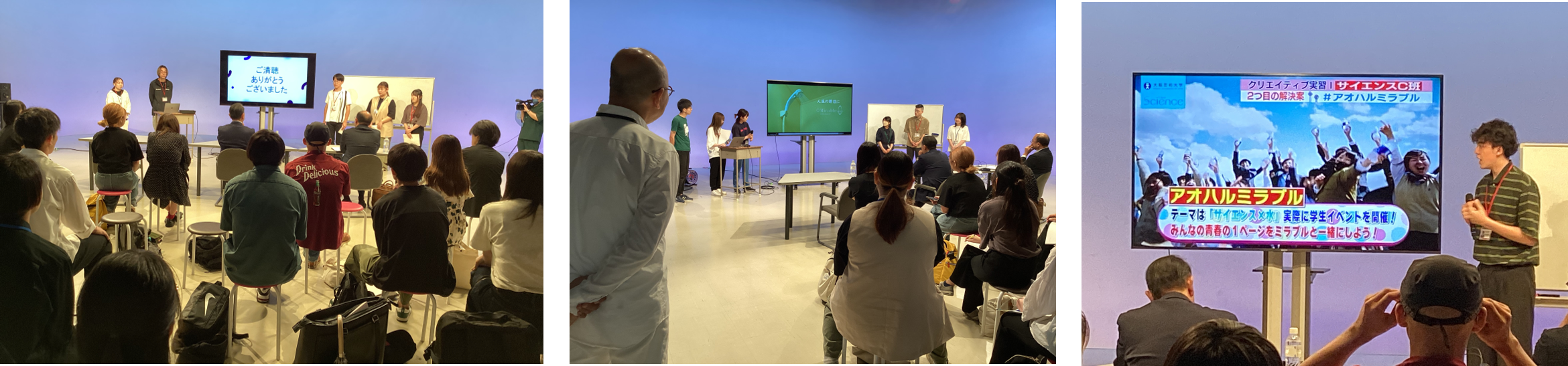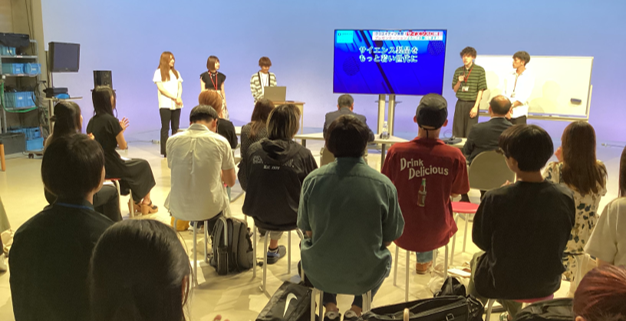 A~Cグループに分かれ、それぞれ15分でサイエンスの製品PRの構成案を発表しました。学生たちは「自分たちのアイデアが、万博に向けたPRとして実現するかもしれない」と意気込み、緊張しながらも斬新なアイデアを発表しました。 “プレゼントとしてミラブルを渡す” 、 “新しい切り口のCMを制作する” 、 “流行りに合わせキャッチーなハッシュタグをつけて発信するSNSを使う”など 3グループがそれぞれ違う角度と媒体を使ってPR案を出しました。