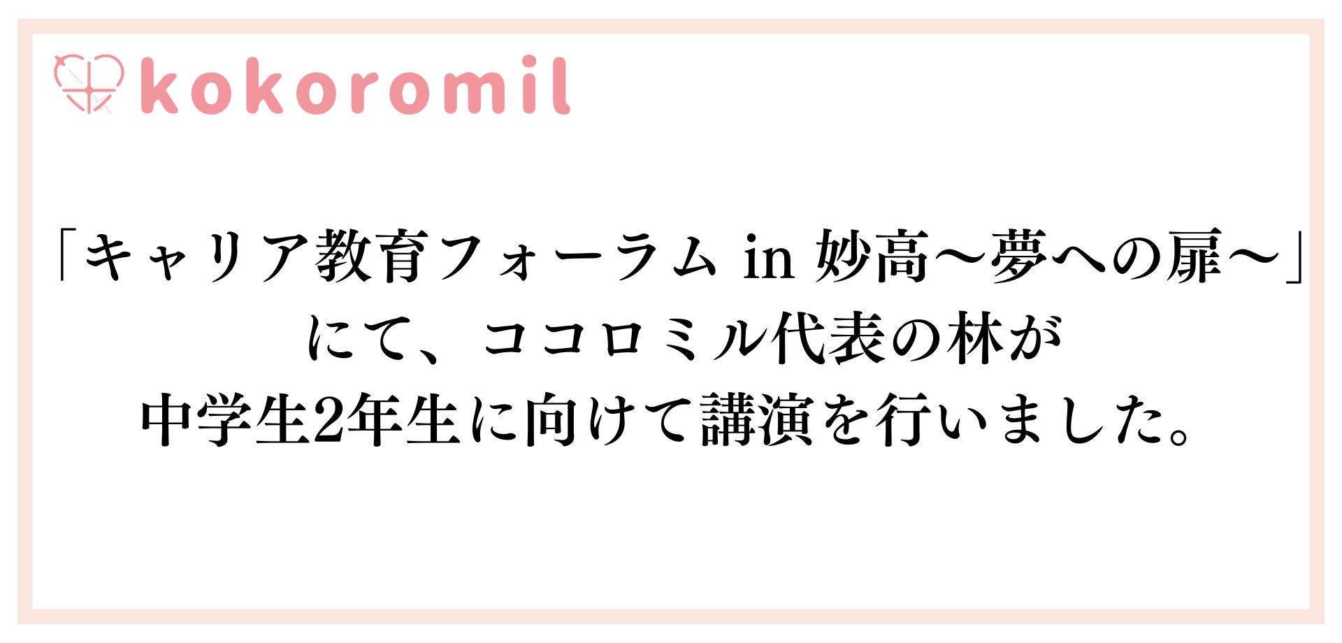 株式会社ココロミル(東京都新宿区、代表取締役社長:林大貴、以下「ココロミル」)は、2024年7月1日(月)に新潟県妙高市で開催された第8回「キャリア教育フォーラム in 妙高~夢への扉~」において、代表の林がアントレプレナーの経験を認められ、中学2年生向けに講師を務めたことをお知らせします。