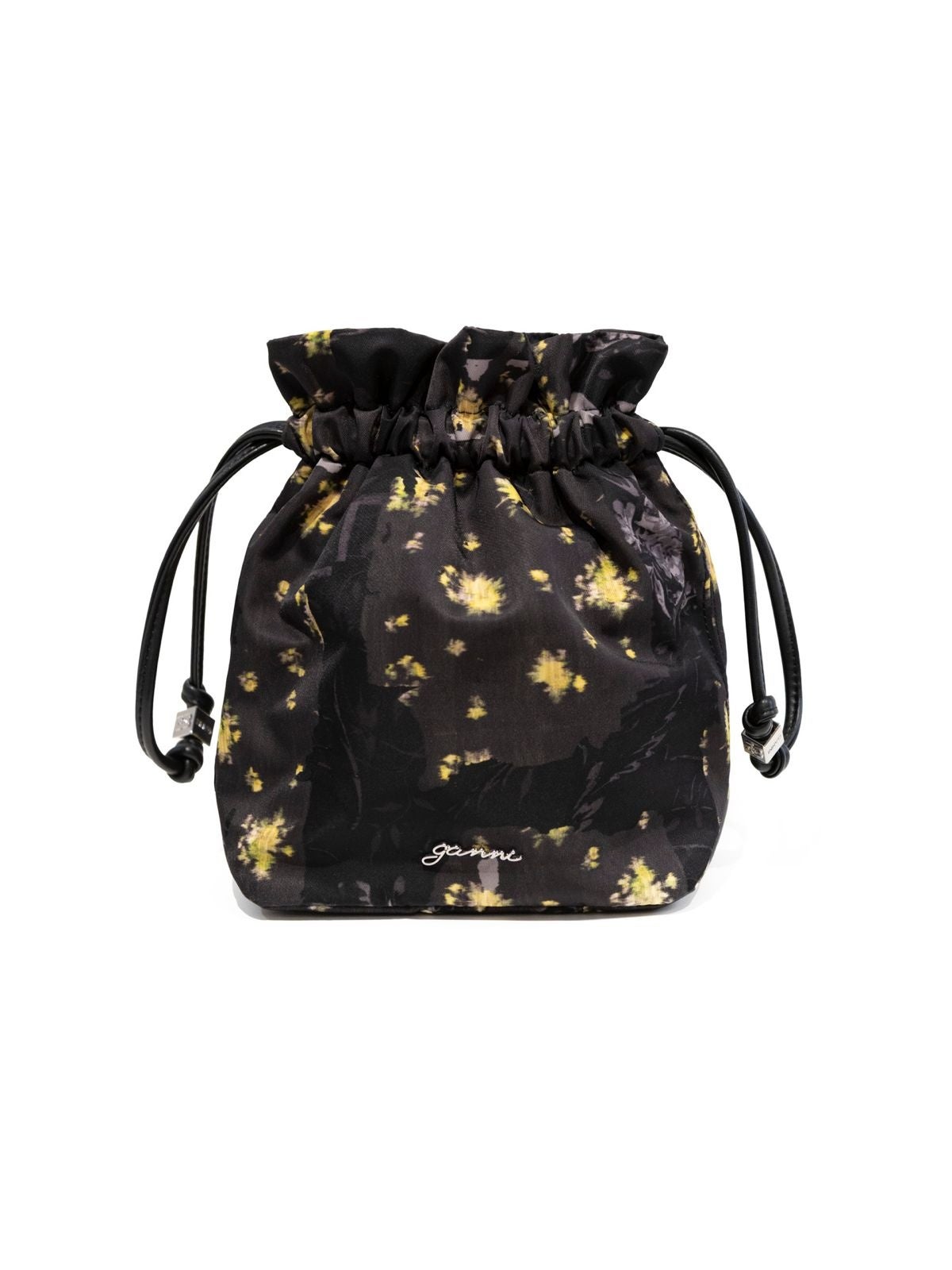 ナイロン素材を使用した本アイテムは、レザーのドローストリング仕様の開閉に加え、GANNIロゴとバタフライロゴの刻印が施されたメタリックダイスがアクセントとなったデザインが特徴で、本体にはリサイクルポリアミド100%、裏地にはリサイクルポリエステル100%を使用しています。