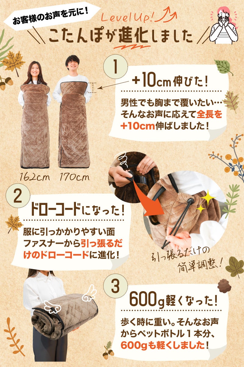 歩きながらでもこたつに入っているかのような温かさを感じられるのが最大の特長の「こたんぽ」。600gの軽量化により歩きやすくパワーアップしました。