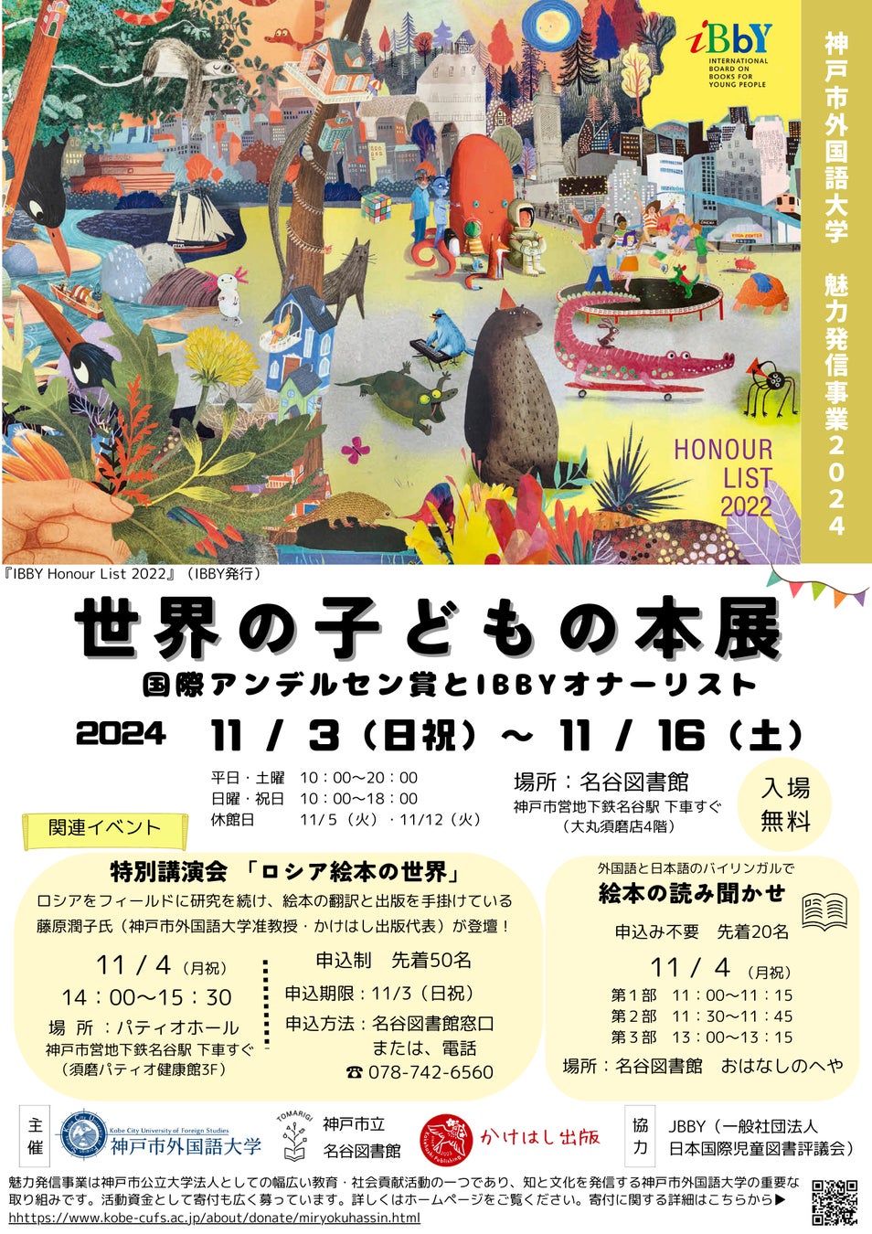神戸市外国語大学(以下、神戸市外大)、神戸市立名谷図書館、合同会社かけはし出版は、三者共催で世界各国の子どもの本を通して国際理解を深めることを目的に、小さなノーベル賞と呼ばれる国際アンデルセン賞受賞作品や国際児童図書評議会(IBBY)オナーリスト作品を展示する「世界の子どもの本展」を開催します。