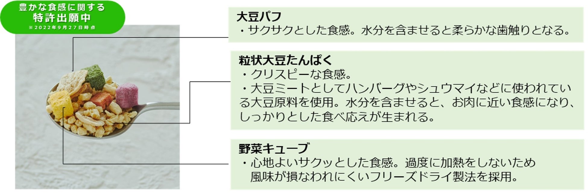 2021年8月より本商品の開発がスタートし、約1年をかけて商品化に至りました。豊かな食感を実現するために、 70種類以上の様々な大豆加工品・野菜加工品を評価・検討を重ねるなど、目指す食感やバランスを追求することに最も苦労しました。特に野菜原料については、食感はもちろん、色味や栄養成分、マグカップに盛った時に存在感を感じられるサイズ感など、様々な試行錯誤を経て、今回の野菜キューブにたどり着きました。ぜひ食感に注目しながら、SOVEシリアルをお楽しみいただければと思います。