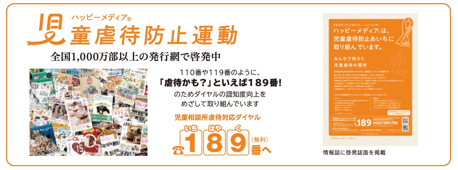 株式会社関西ぱど(本社:大阪市西区靭本町1-10-24 三共本町ビル5F 代表取締役 富岡 紀幸)は、児童虐待防止を推進するため、全国で発行する地域みっちゃく生活情報誌®の「児童虐待防止運動」に参加しています。これは、児童相談所虐待対応ダイヤル「189(いちはやく)」の周知のため、情報誌の記事掲載やポスター掲出などに取り組む運動です。