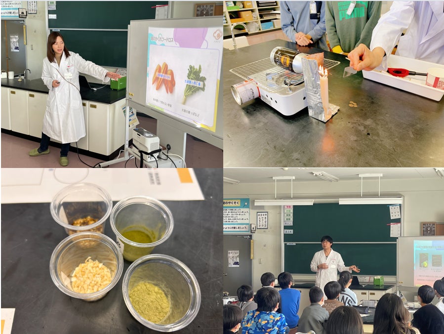 本プログラムでは、女子栄養大学の学生と富士見市学校給食センターが共同開発した『ぐるりこ®(※2)』を使用した給食が市内の小学校11校約6000名と中学校6校約2600名に1日限定で提供され、食事をしながら「かくれフードロス」について学ぶことができる教材を配布しました。また、ASTRA FOOD PLAN代表の加納の母校である埼玉県富士見市立諏訪小学校の小学5年生約120名に対しては、科学技術の発展と地球貢献の実現を目指す株式会社リバネス(東京都新宿区、代表取締役 グループCEO:丸幸弘)と連携し、科学実験を用いた特別授業を実施いたしました。