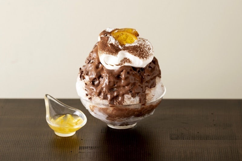 サンフランシスコ発のBean to Barチョコレート専門店「ダンデライオン・チョコレート」のチョコレートを使用した濃厚なダークチョコレートソースに、ちょっと苦みや酸味を感じられる皮の部分を使用したさわやかなオレンジソースを加えた、大人の味わいのかき氷です。オレンジスライスは、熊本県産のネーブルオレンジを1つ1つ丁寧にスライスしシロップに漬け込んだもの。グランマニエのトッピングで更に大人の味わいに。食べ進めるにつれ変化していく味わいに新しさと可能性を感じるかき氷です。