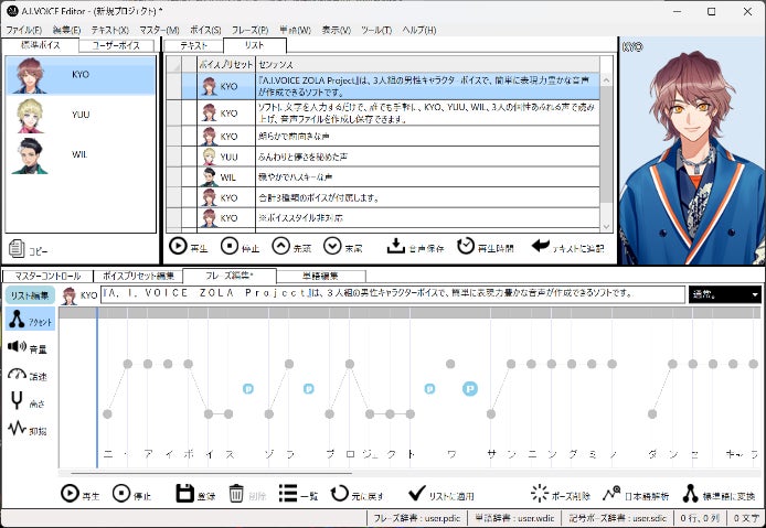 『A.I.VOICE ZOLA Project』は、3人組の男性キャラクターボイスで、簡単に表現力豊かな音声が作成できるソフトです。ソフトに文字を入力するだけで、誰でも手軽に、KYO、YUU、WIL、3人の個性あふれる声で読み上げ、音声ファイルを作成し保存できます。