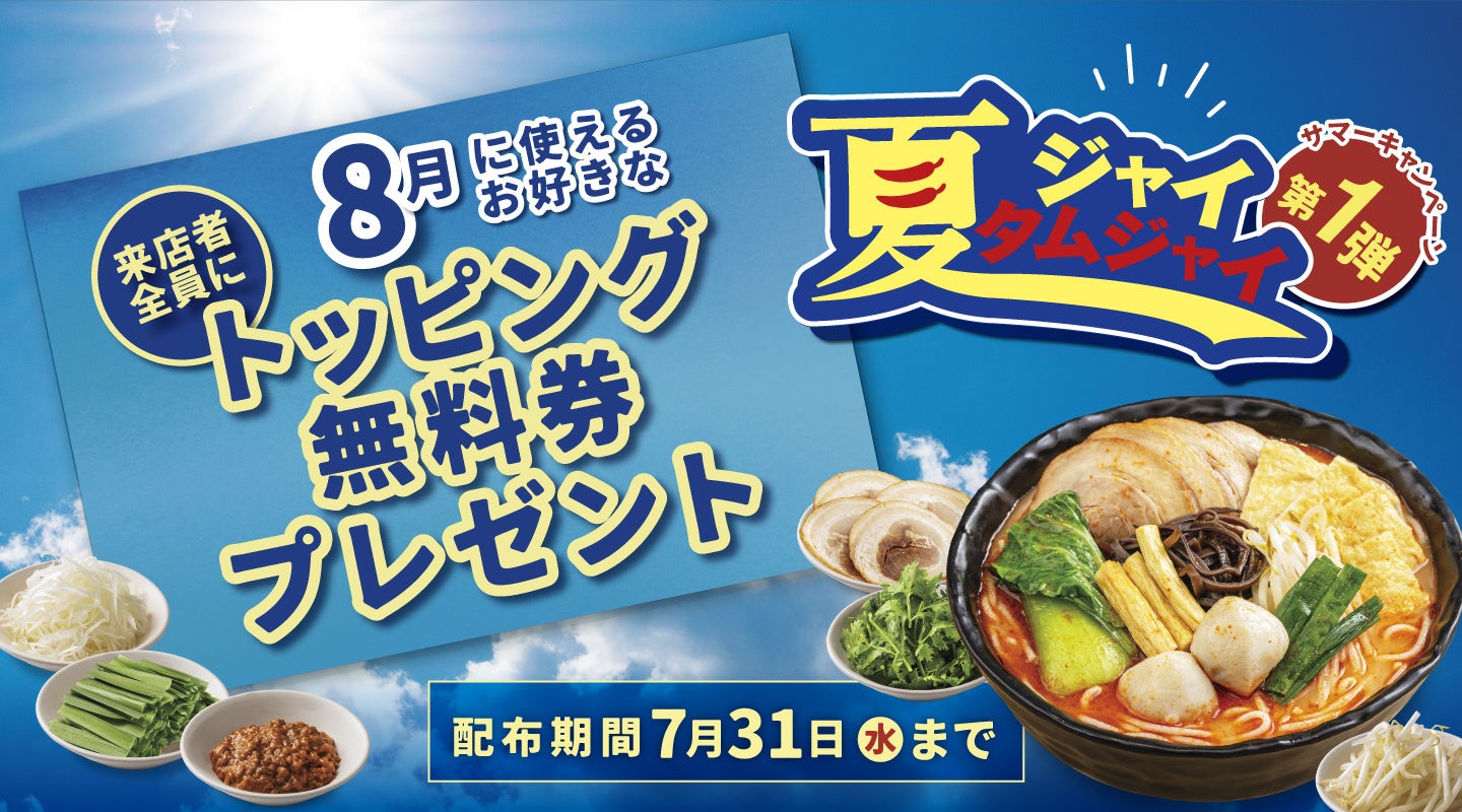 タムジャイサムゴー夏限定キャンペーン第1弾を実施8月に使えるお好きなトッピング無料券をプレゼント