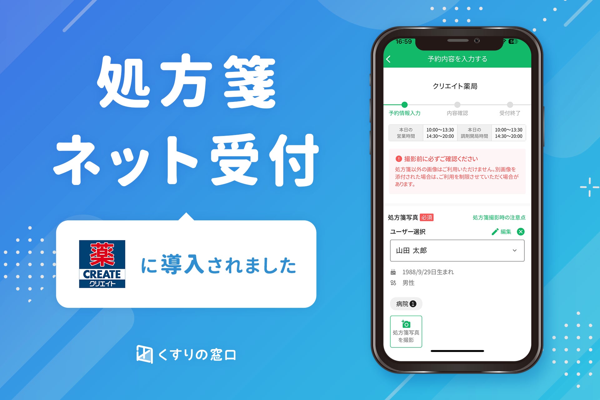 株式会社くすりの窓口(本社:東京都豊島区、代表取締役社長:堤 幸治、以下「当社」)の運営する処方せんネット受付サービス「EPARKくすりの窓口」(以下「当サービス」)につきまして、新たに株式会社クリエイトエス・ディーの運営する調剤薬局に導入されましたことをご報告いたします。
